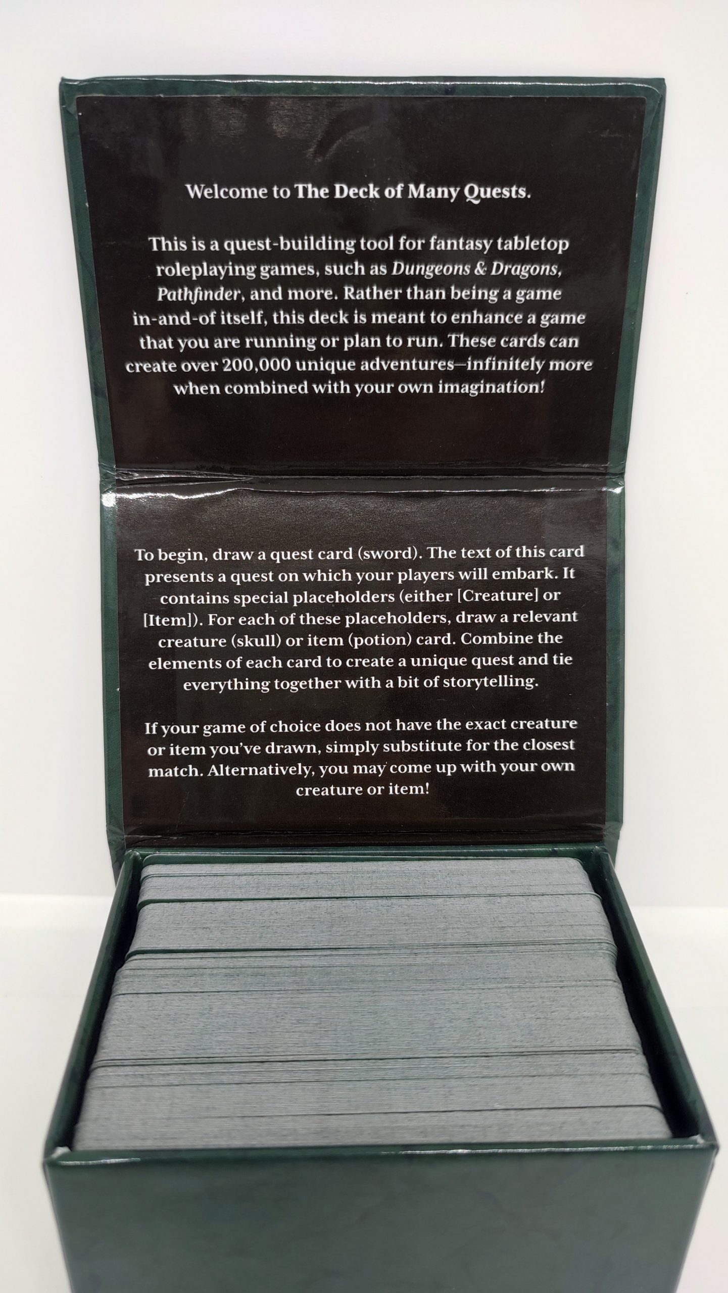 The Deck of Many Quests is a product with a specific target that must be taken into consideration. It can certainly be said that it is a quality product. It can be said without a shadow of a doubt that the materials are more than good and the price in line with the product. But keep in mind what it can add to your sessions.