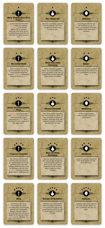 Explaining how The Deck of Many Quests works is the simplest part of this review. You draw a quest card and read the text. It is basically the core of an adventure. The text indicates one or more generic tags [object] or [creature]. By extracting the cards corresponding to the label from the respective decks, the quest text is completed. If randomness generates an unlikely or hardly manageable result, the problematic card is replaced with the next one from the corresponding deck.
