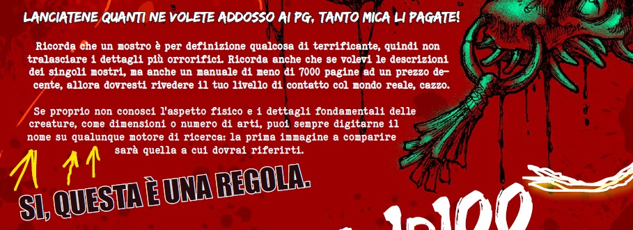 è portare il buonumore e irridere alcuni comportamenti tossici e negativi tipici ahimé del nostro ambiente. Il bullismo al tavolo, il gatekeeping, i comportamenti sgradevoli e sgraditi meritano solo di essere ridicolizzati e scherniti, esattamente come vogliamo fare noi con questo norstro gioco. Peraltro, come norma generale, vi consiglio di non prendere mai troppo sul serio qualunque cosa scritta in un libro che parla di creature infernali, divinità vendicative e antichi rituali miracolosi. Quindi, canalizzate il peggio di voi e rideteci sopra tutti insieme