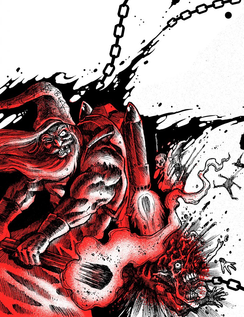 Le grafiche urlano old fantasy, epic metal e tamarraggine. Sono perfettamente inserite nel contesto e sono un piacere da scoprire via via che si sfogliano le pagine. L’impaginazione segue questo carattere estremo ed è un trionfo di caos, linee diagonali, cambi di font, dimensioni e proporzione delle pagine da prendere a schiaffi gli occhi ma titillare la voglia di spaccare.