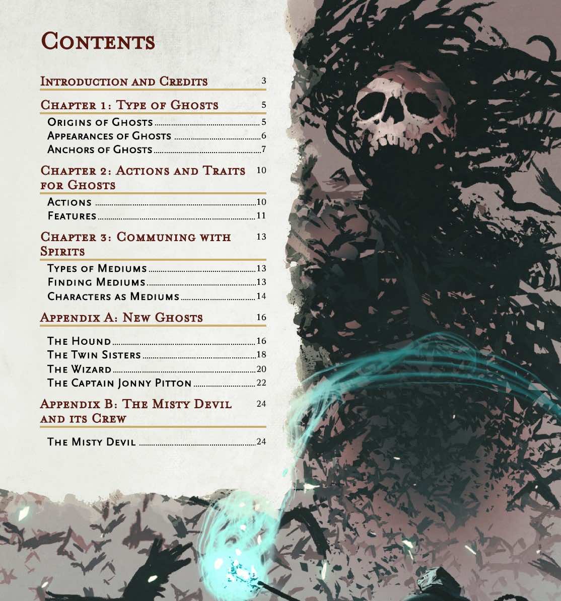 The first chapter is devoted to the classification of types of ghosts. How did they become such? What is their appearance? What prevents them from passing through? This section offers very valid ideas for creating situations and encounters out of the usual stereotypes, avoiding that every infestation of your campaign always seems similar to the previous ones.