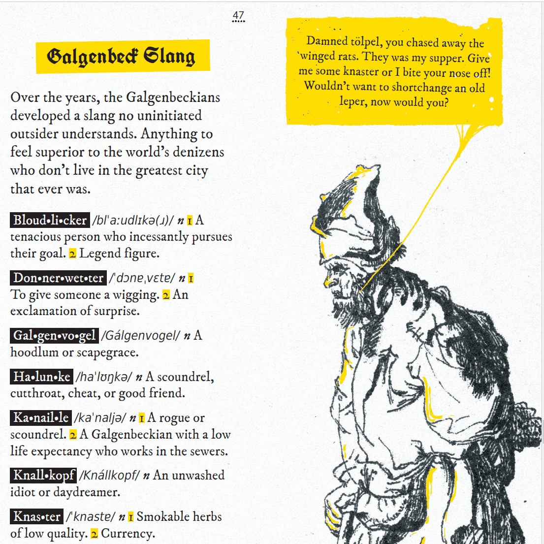 Ciò che più mi affascina, però, sono probabilmente tutti i contenuti extra che rendono l’avventura più profonda e più “viva”. Sono presentati personaggi bizzarri e inquietanti, descrizioni di distretti e luoghi di rilievo (sia conosciuti che nascosti), mappe specifiche, nemici ricorrenti che popolano Galgenbeck, dicerie, una tabella con 100 incontri casuali specifici e addirittura alcuni modi di dire del dialetto specifico del luogo.