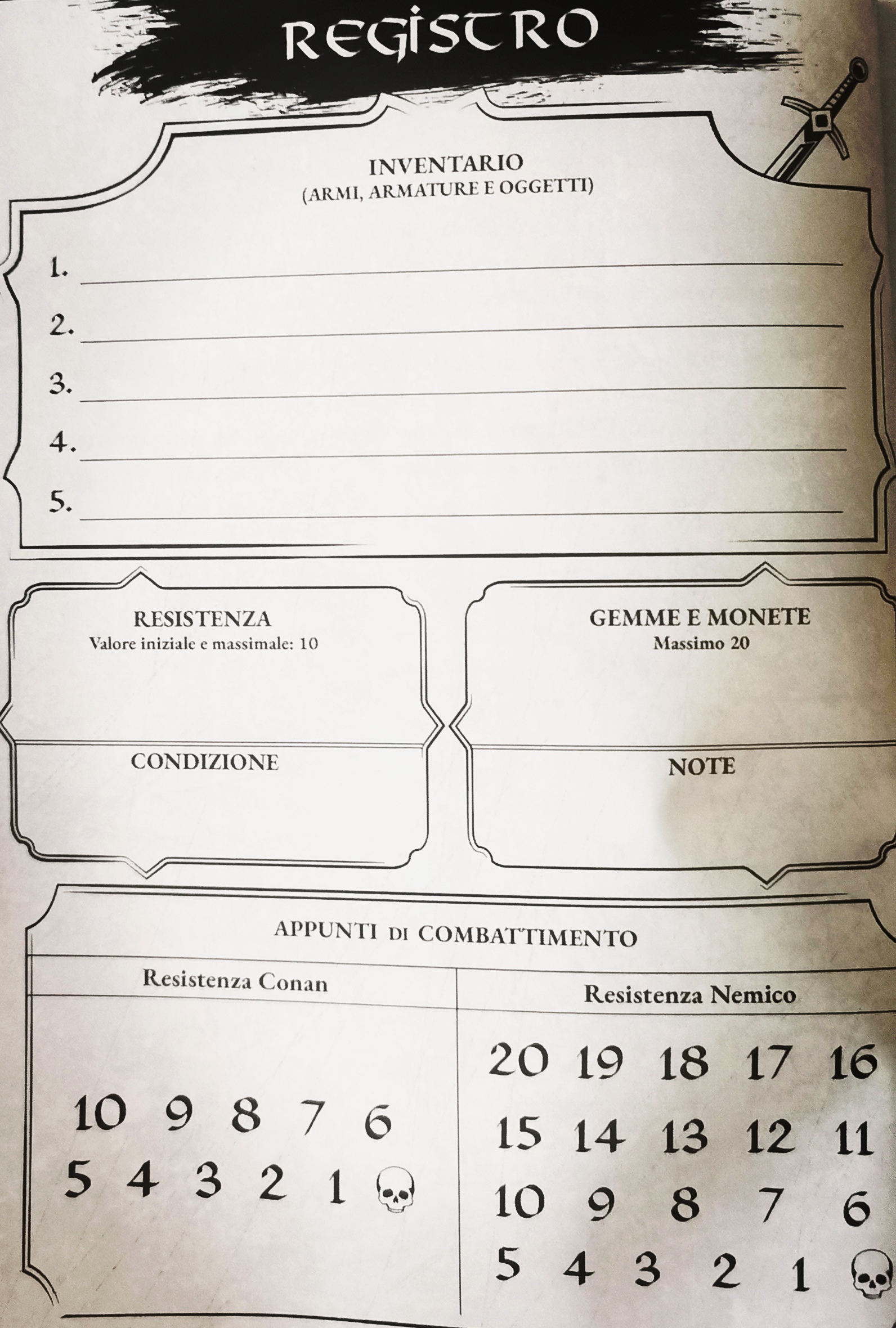 Queste sono le sezioni principali della scheda del protagonista. In ultimo ci sono due comodi riquadri per tenere conto dei punti vita di Conan e di chiunque sia così folle da mettersi sulla sua strada.