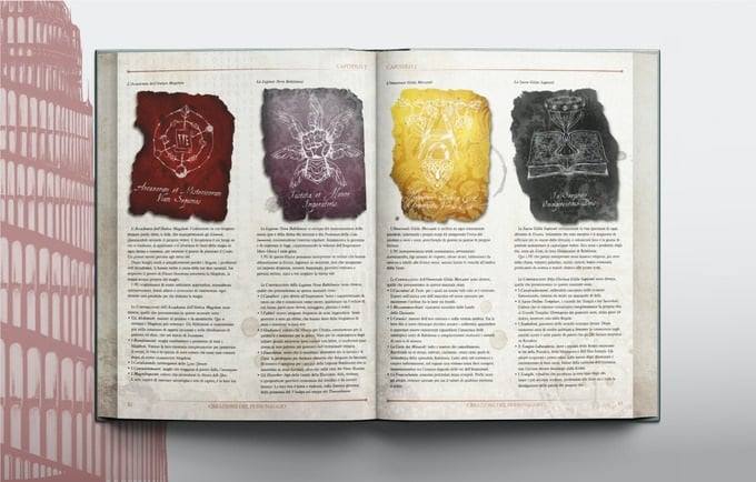 Quando si parla di manuali, Etemenanki entra di diritto nella categoria dei pesi massimi. Vi troverete tra le mani più di seicento pagine di informazioni che dimostrano la passione e il grande lavoro che è stato portato avanti in questi anni. L’impaginazione mantiene principalmente una struttura a due colonne, alternando in alcune occasioni porzioni a colonna singola. L’impatto visivo e la leggibilità di questo manuale sono di altissimo livello. Ad un font classico che ci racconta le regole di Etemenanki, se ne alterna in alcuni punti uno più ricercato; questo è utilizzato su stralci di pergamena che ci raccontano dettagli di questo mondo strappati direttamente dalle mani dei suoi abitanti.