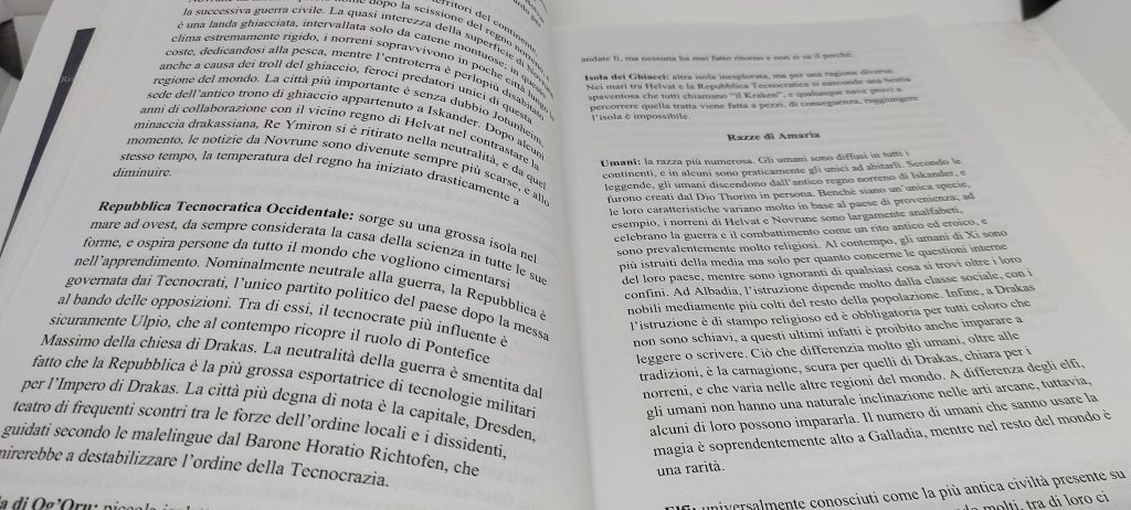 Passiamo ora agli aspetti meno piacevoli. Sulla copertina del libro non è presente una maiuscola nel titolo, non una questione da poco siccome è la prima cosa che vedi prendendolo in mano. Nel retro del libro si può trovare una breve introduzione all’autrice, ma non c’è traccia di un’introduzione al romanzo; come faccio a sapere cosa andrò a leggere? All’inizio dell’opera sono presenti delle mappe del mondo di Amaria ma purtroppo, a causa della scarsa qualità delle immagini e della loro impaginazione approssimativa, non tutti i nomi dei luoghi sono chiari e leggibili. Infine, quasi tutto il testo è completamente allineato a sinistra, non permettendo una lettura spedita.